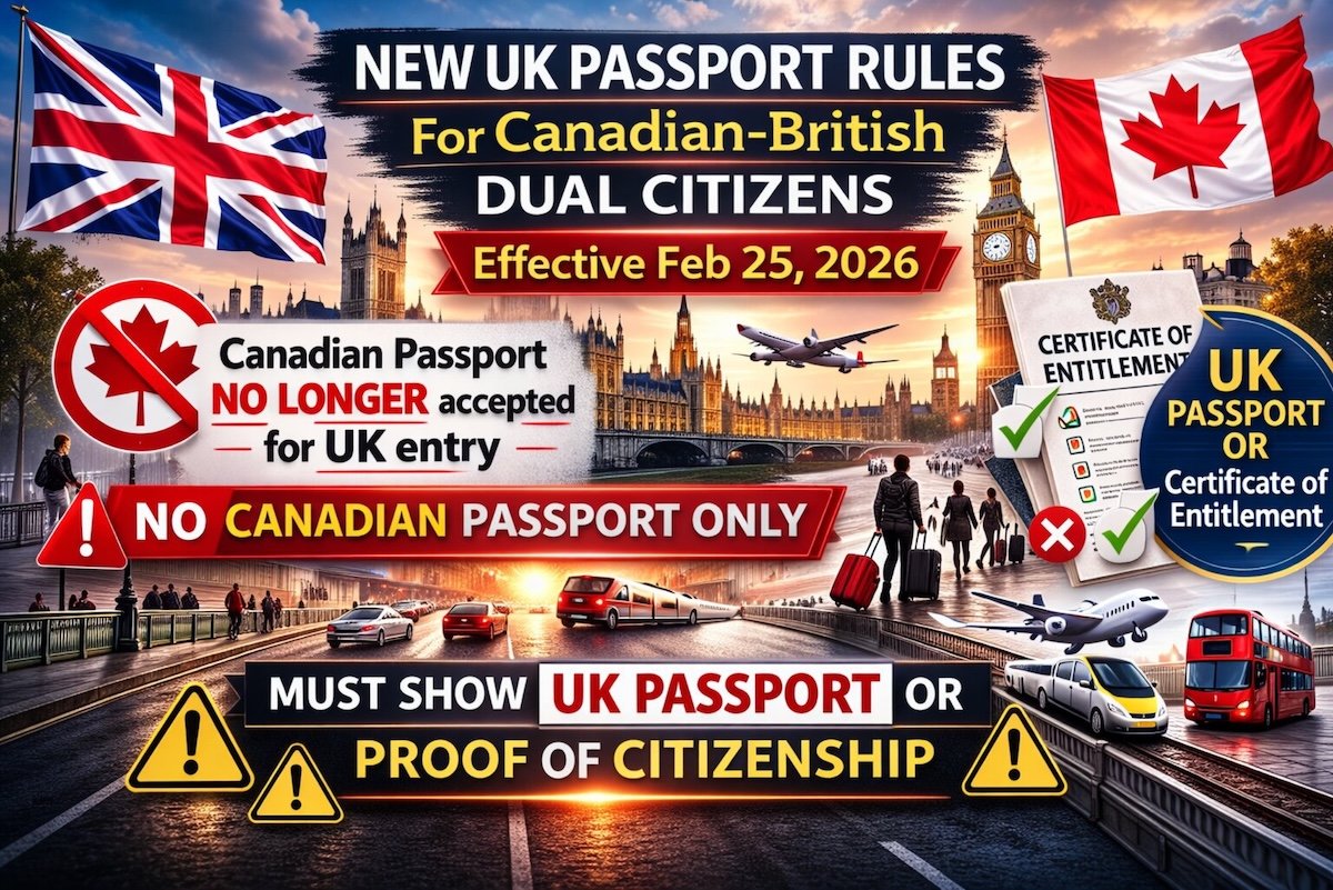 The UK Home Office has announced that Canadian-British dual citizens can no longer enter the UK using only their Canadian passport. Starting February 25, 2026, individuals must possess a valid British passport or a Certificate of Entitlement to prove their right to enter the country.
